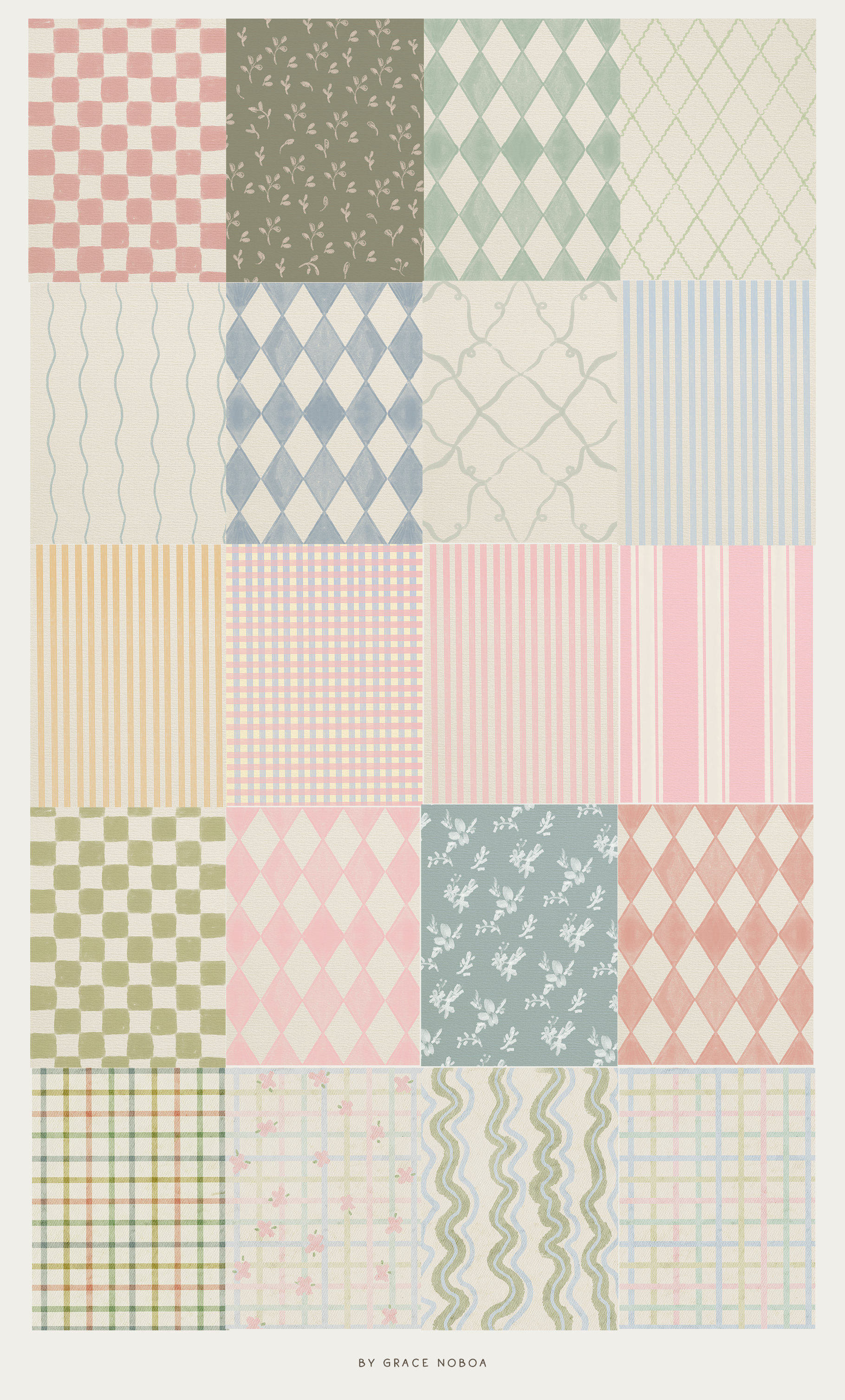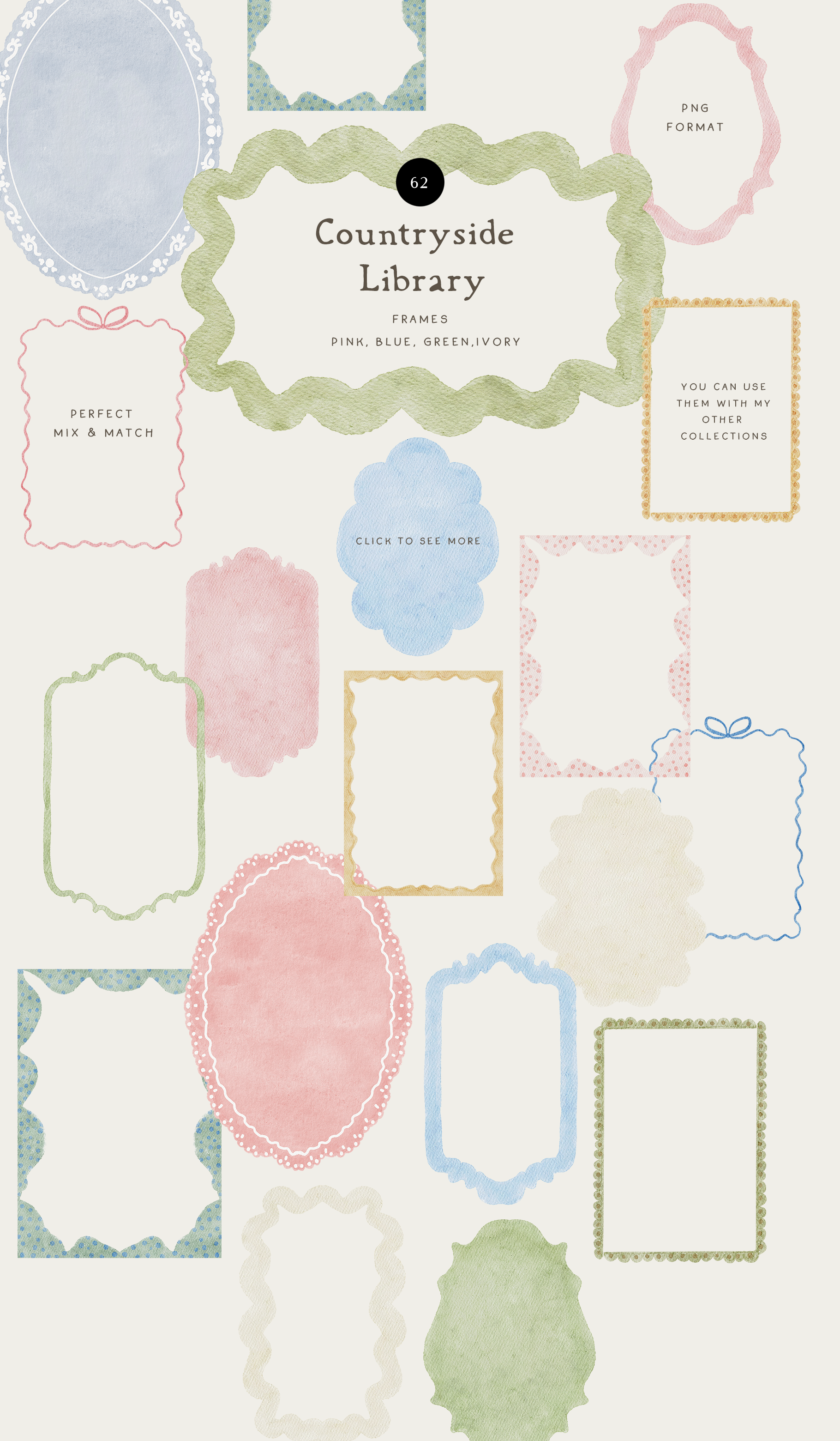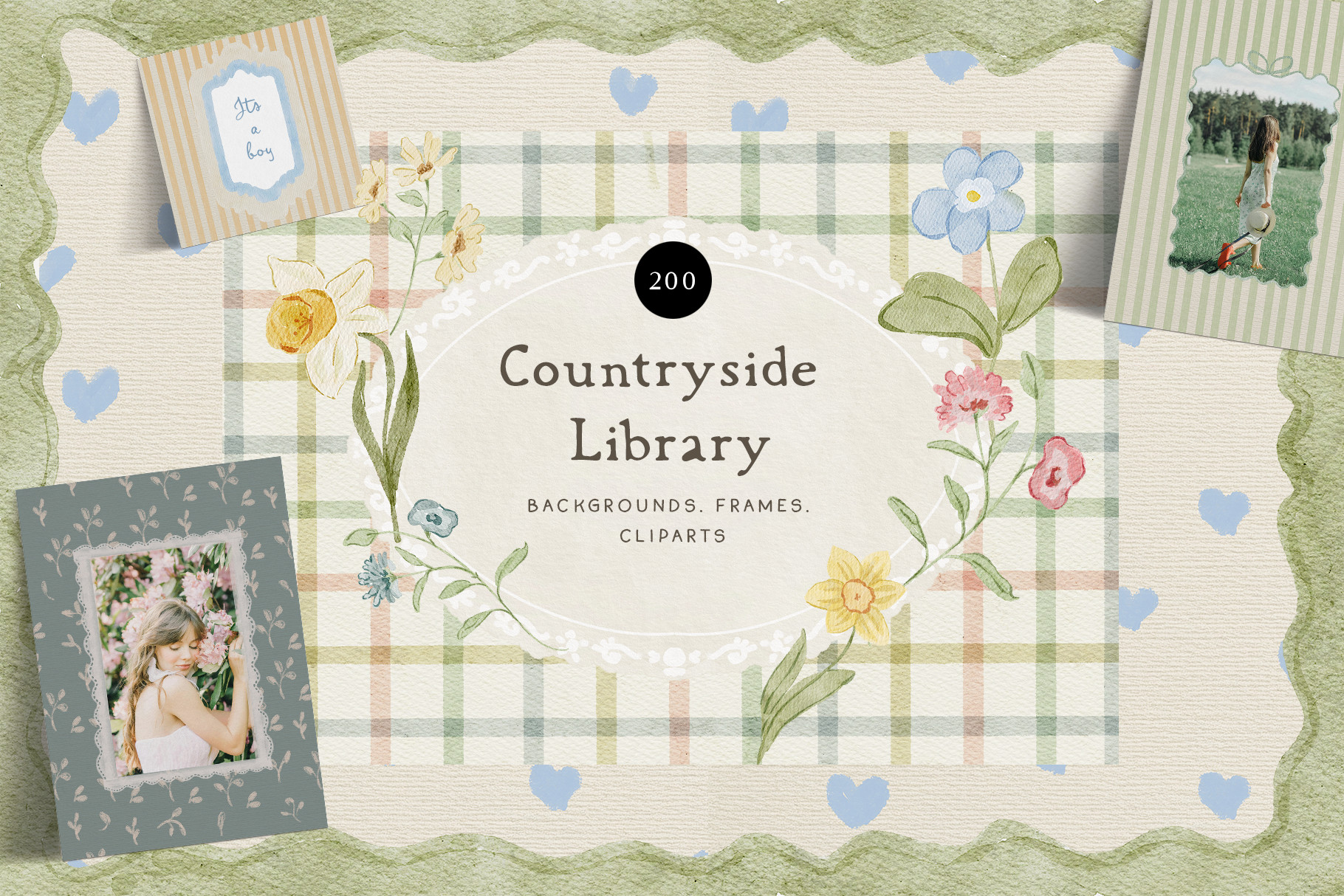 Bring a soft countryside charm to your designs with this beautifully curated collection Countryside Library of textured backgrounds, decorative shaped frames, and delicate floral elements. Inspired by vintage cottage aesthetics, pastoral color palettes, and romantic paper goods, this bundle features a lovely mix of gingham, plaid, checkerboard, stripes, subtle botanical details, and softly textured surfaces that feel warm, checkered, nostalgic, and timeless. Versatile & easy to mix and match backgrounds, floral accents, and decorative frames across a wide range of creative projects. Even with other of my collections.