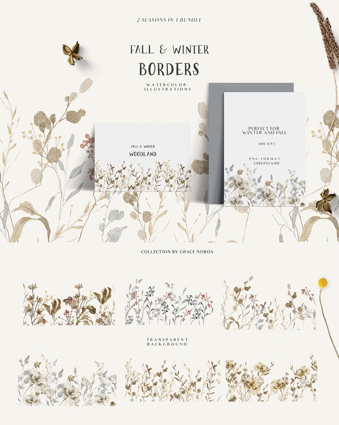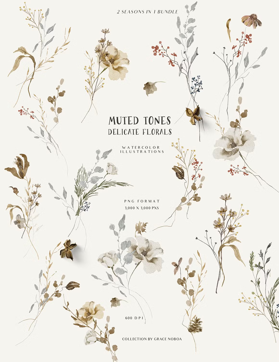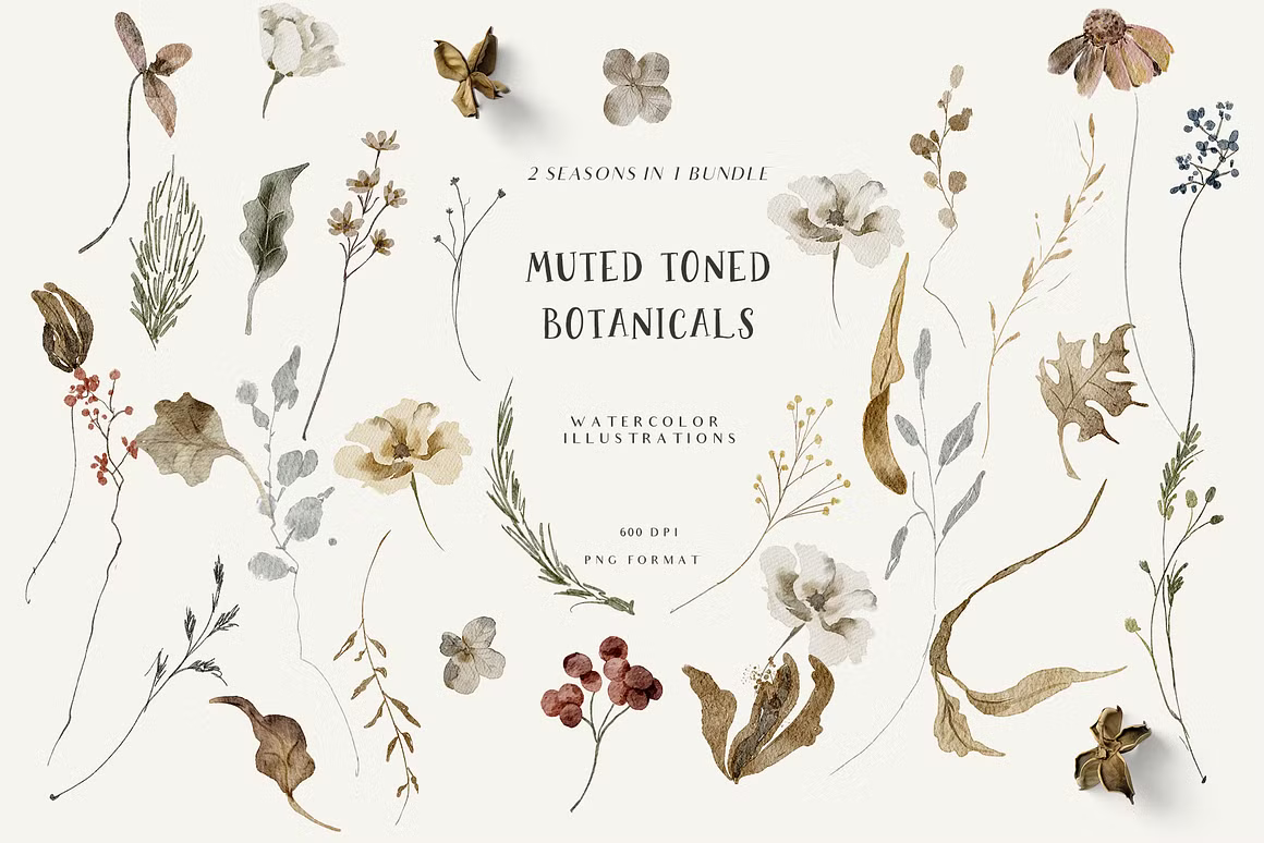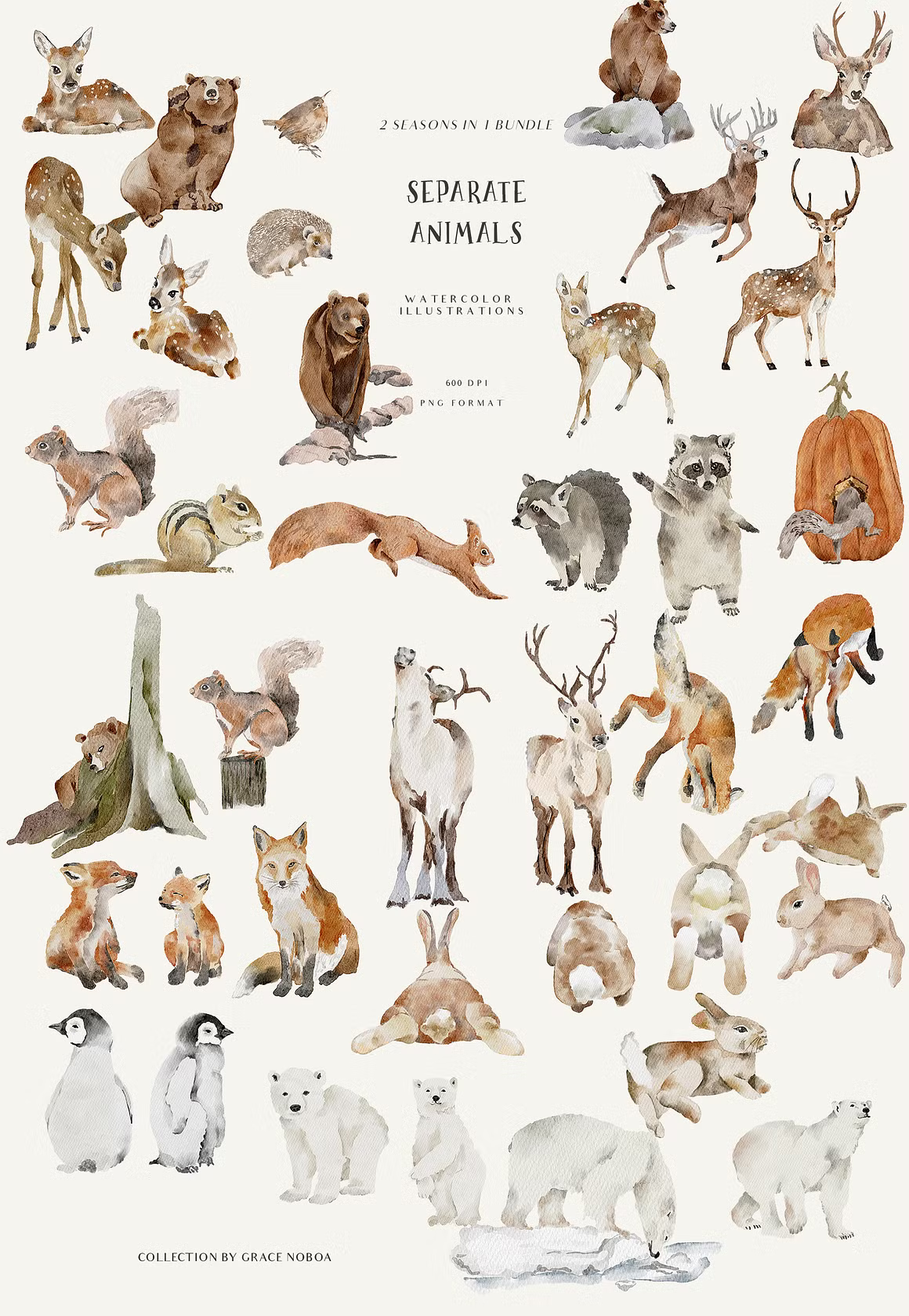 "FALL & WINTER" watercolor collection will make you fall in love with every baby animal you can find in the forest, flowers in muted tones and trees. You can find a fox, deer, bears, bunny, squirrel, raccoon, hedgehog and more! You will find floral bouquets, wreaths and so many fall and winter compositions too.