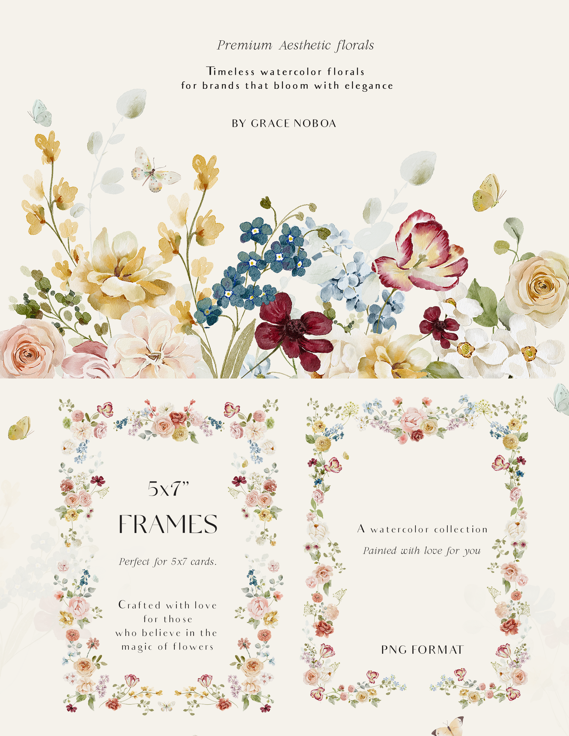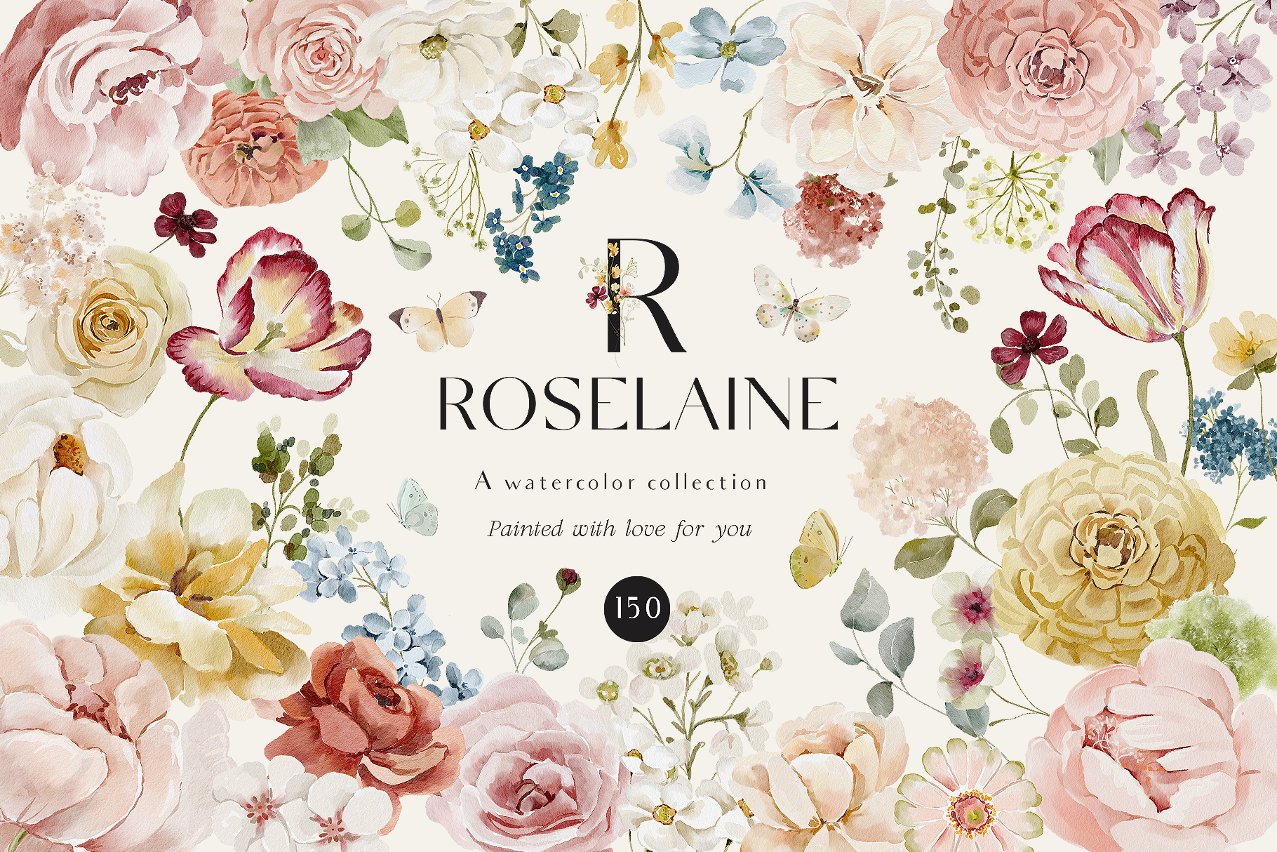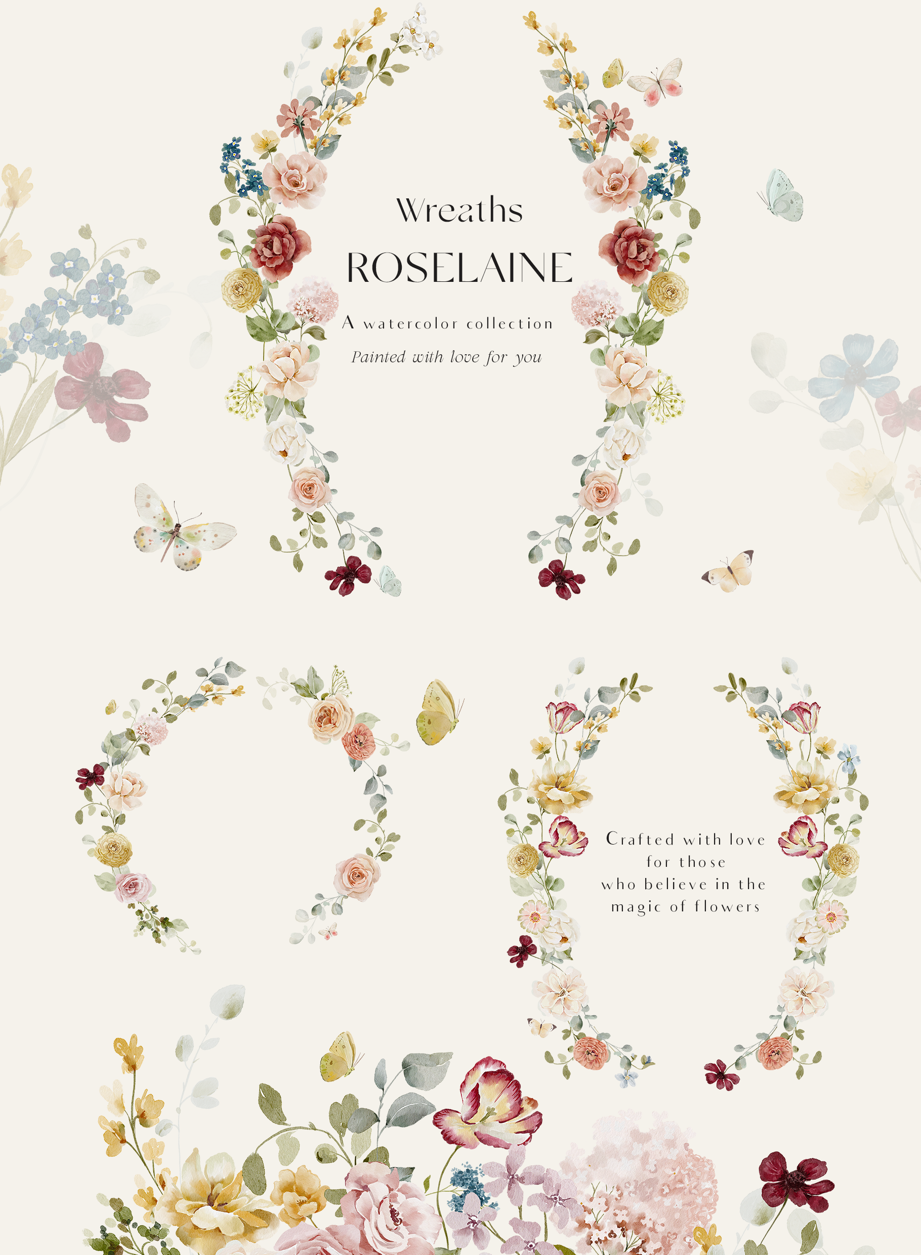 Roselaine is a watercolor floral collection designed for creators, dreamers, and brands who appreciate beauty in every detail. Hand-painted botanicals to elevate your projects with softness, elegance, and charm. Feauturing a color palette of Mustard yellow, red, burgundy, pink blush, blue, indigo, peach, ivory, champagne, violet along with charming butterflies an detailed florals like roses, forget me not, tulips, wax flowers, ranunculus and greenery. A very trendy and timeless color palette, to use like or match your desire color palette