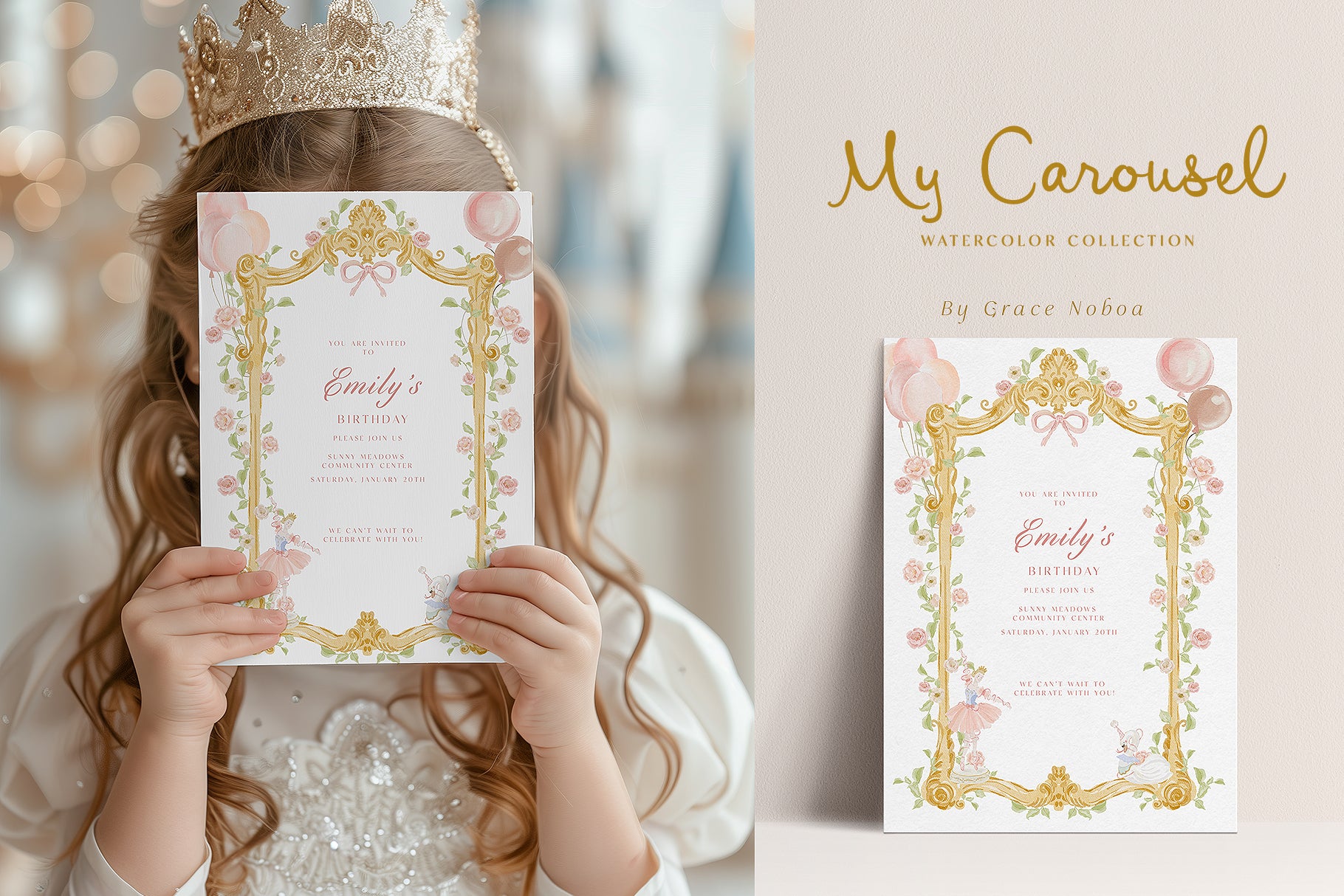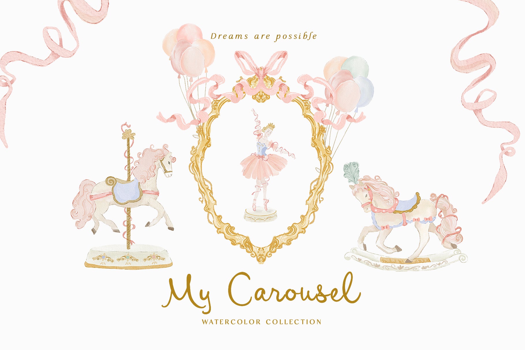 I'm so in love with my new collection🦢✨🩰 🩷*My Carousel* watercolor collection🩷 Feauturing Swams, Unicorn, hourses, princess ballerina, air ballon, ribbons, birthday ballons and vintage aesthetics. Painted with love***